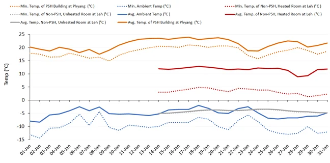 The diagram above compares the indoor temperature of a PSH Building with a heated and non-heated room of a non-PSH Building. The PSH building at Phyang stays at around 20-25 °C daily average temperature using only solar energy, with minimums of up to 15 °C only. While the fossil-fuel heated room in a typical building in Leh averages at around 12 °C. The non-heated room in the same building stays between -5 °C to -3 °C. The outside temperature fell to as low as -15 °C minimum in the same time period.